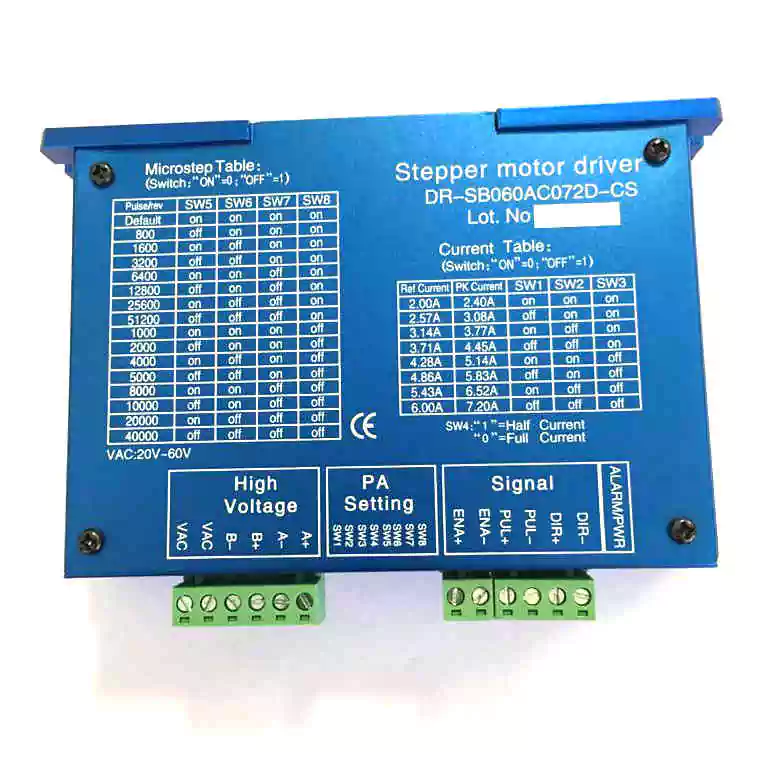 O Driver DR-SB060AC072D-CS Action faz parte de uma nova geração de drivers digitais para motores de passo de alto desempenho baseados em DSP (Digital Signal Processor) com avançados algoritmos de controle. Os motores controlados pelo DR-SB060AC072D-CS podem operar com níveis de ruídos e vibrações muito inferiores a outros drivers disponíveis no mercado. As principais características do DR-SB060AC072D-CS são seus baixos níveis de ruídos, vibrações e aquecimento. O Driver DR-SB060AC072D-CS pode ser alimentado com tensão DC entre 20V e 60V. Compatível com motores de passo híbridos bifásicos com corrente entre 2.4A e 7.2A por bobina e 14 opções de micropassos selecionáveis com opções até 51200 passos por revolução (configuração de micro passos de 1/256). O Driver DR-SB060AC072D-CS possui proteções contra sobre tensão, subtensão e sobre corrente.